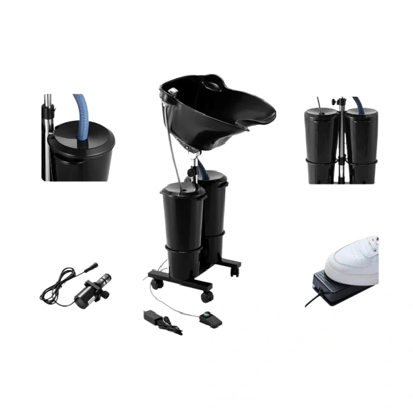 Dit is een draagbare wasbak (shampoo bowl) met een elektrische pomp, speciaal ontworpen voor gebruik in kapsalons, voor thuiskappers of voor de verzorging van ouderen en minder mobiele personen.