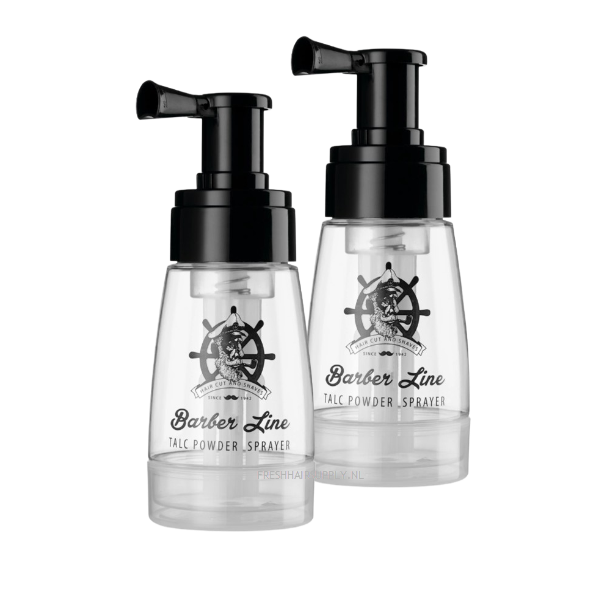 Spuitfles met sproeikop voor talkpoeder, afsluitbaar en lekvrij. Handig voor onderweg en in de salon.